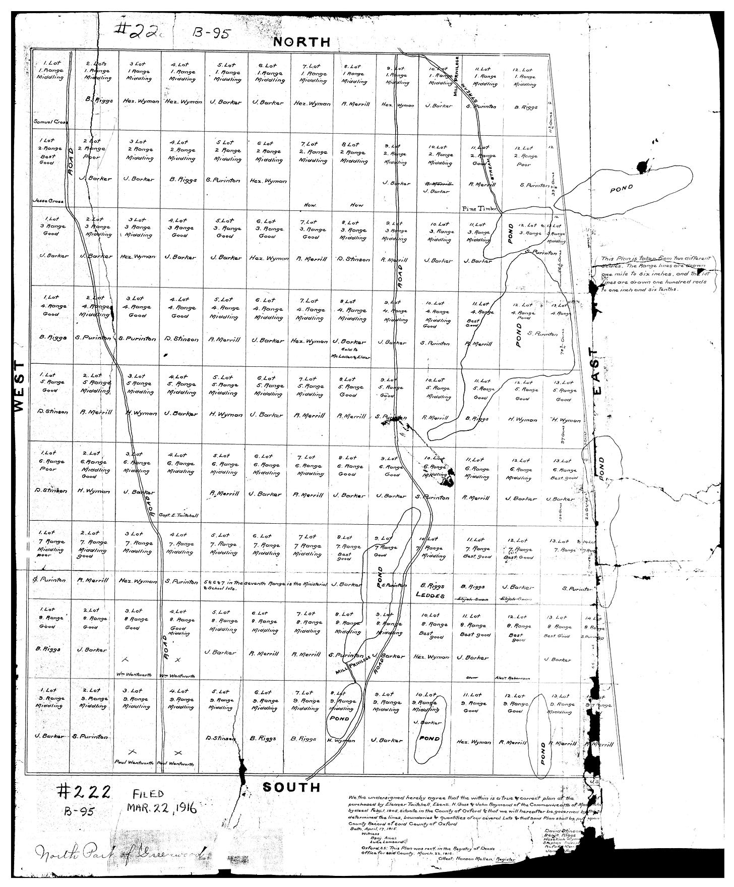 For the grading of Purinton’s lots, see Oxford Deeds (Eastern), Plan No. 222 (1815). Deed of Purinton to Locke, Oxford Deeds (Eastern), Book 43, p. 498. Greenwood property tax vendue, Oxford Deeds (Eastern), Book 25, p. 397.