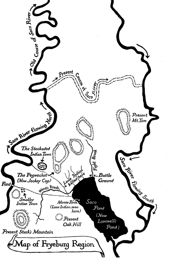 One other minor detail that Mrs. Ecktorm corrected in the traditional account is that Lovewell’s men saw the first lone Native on Moose Rock, on the western side of the pond, rather than on Indian Point, which is on the east side.